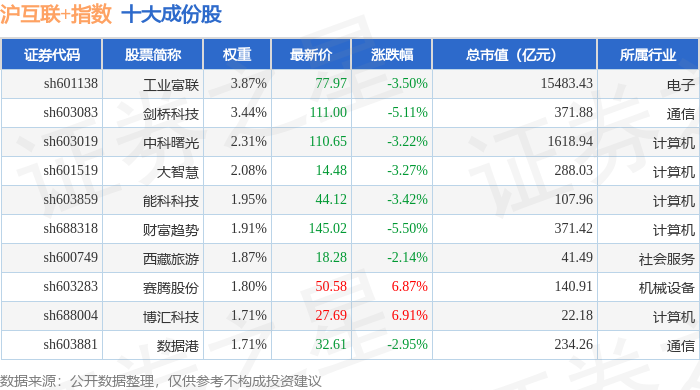 资金流向方面,沪互联+(000162)指数成份股当日主力资金净流出合计44.09亿元,游资资金净流入合计9.83亿元,散户资金净流入合计34.27亿元。成份股资金流向详情见下表: