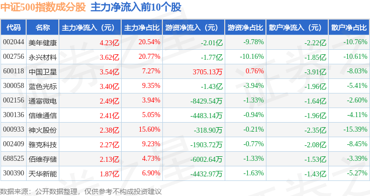 资金流向方面,中证500(000905)指数成份股当日主力资金净流出合计260.36亿元,游资资金净流入合计90.79亿元,散户资金净流入合计169.57亿元。成份股资金流向详情见下表: