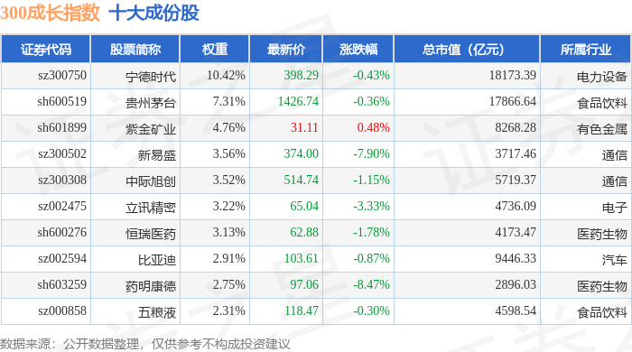 证券之星消息,10月30日,300成长(000918)指数报收于5154.15点,跌1.35%,成交3122.39亿元,换手率1.35%。当日该指数成份股中,上涨的有37家,阿特斯以9.5%的涨幅领涨,下跌的有61家,天孚通信以11.56%的跌幅领跌。