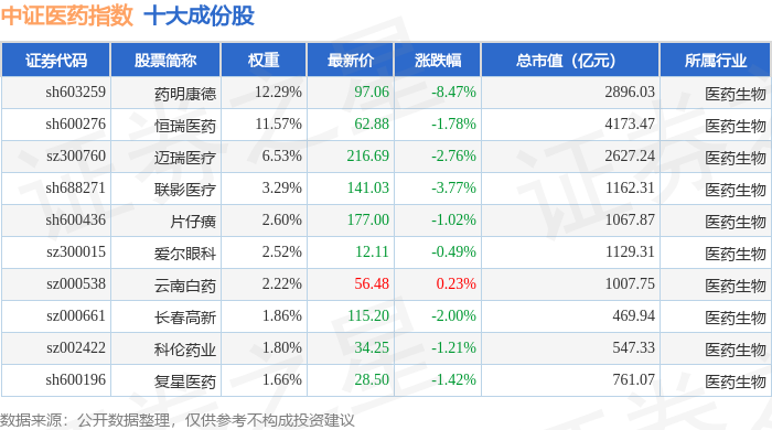 中证医药(000933)指数十大成份股详情如下:
