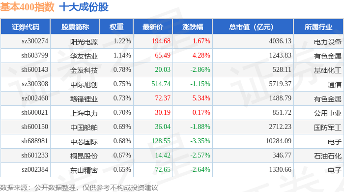 基本400(000966)指数十大成份股详情如下:
