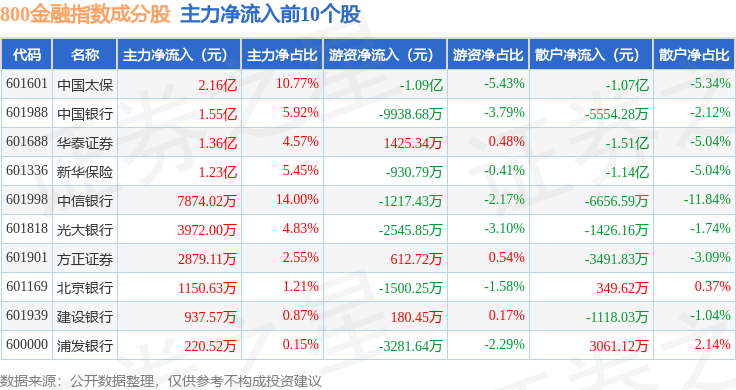 资金流向方面,800金融(000974)指数成份股当日主力资金净流出合计37.06亿元,游资资金净流入合计13.2亿元,散户资金净流入合计23.86亿元。成份股资金流向详情见下表: