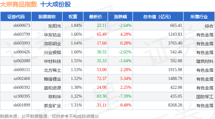 证券之星消息,10月30日,大宗商品(000979)指数报收于6514.58点,涨0.32%,成交1714.28亿元,换手率1.45%。当日该指数成份股中,上涨的有46家,永兴材料以10.01%的涨幅领涨,下跌的有53家,菲利华以7.39%的跌幅领跌。