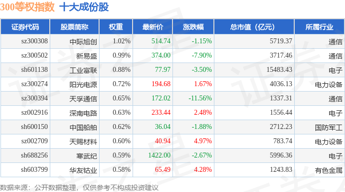 证券之星消息,10月30日,300等权(000984)指数报收于4775.17点,跌0.63%,成交7199.56亿元,换手率0.83%。当日该指数成份股中,上涨的有115家,招商轮船以10.02%的涨幅领涨,下跌的有177家,天孚通信以11.56%的跌幅领跌。