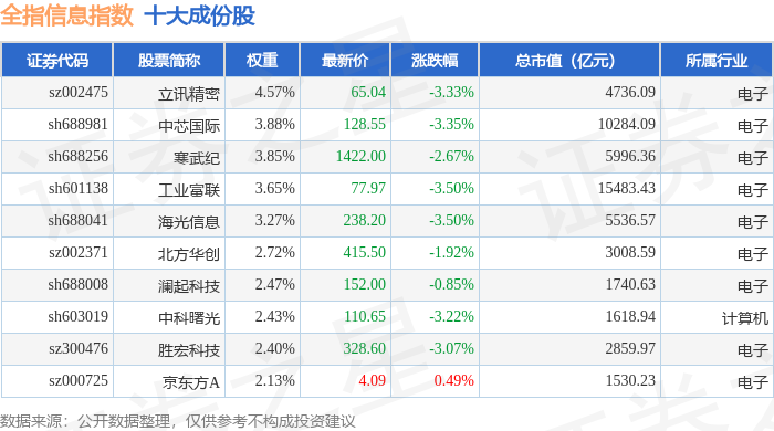 证券之星消息,10月30日,全指信息(000993)指数报收于8986.88点,跌2.13%,成交3685.57亿元,换手率2.84%。当日该指数成份股中,上涨的有29家,同方股份以9.95%的涨幅领涨,下跌的有128家,晶晨股份以9.71%的跌幅领跌。
