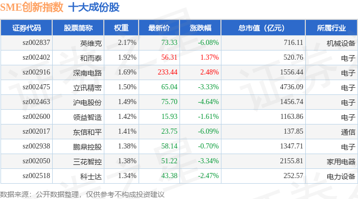 SME创新(399017)指数十大成份股详情如下: