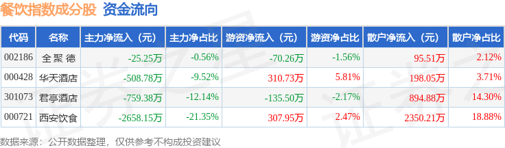 资金流向方面,餐饮指数(399238)成份股当日主力资金净流出合计3951.57万元,游资资金净流入合计412.91万元,散户资金净流入合计3538.66万元。成份股资金流向详情见下表:
