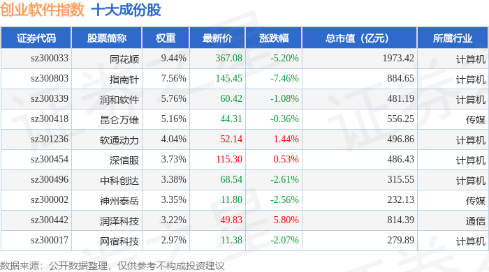 证券之星消息,10月30日,创业软件(399264)指数报收于1520.42点,跌1.87%,成交489.75亿元,换手率3.76%。当日该指数成份股中,上涨的有10家,北信源以7.07%的涨幅领涨,下跌的有39家,顺网科技以7.6%的跌幅领跌。