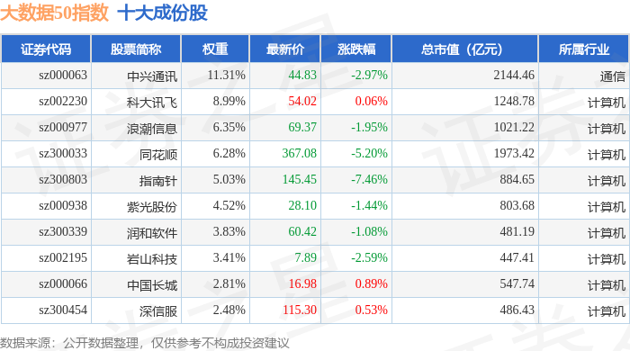 证券之星消息,10月30日,大数据50(399282)指数报收于5437.79点,跌1.87%,成交719.75亿元,换手率4.13%。当日该指数成份股中,上涨的有11家,神州信息以9.98%的涨幅领涨,下跌的有38家,顺网科技以7.6%的跌幅领跌。