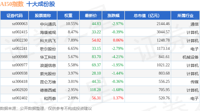 证券之星消息,10月30日,AI50(399284)指数报收于4054.7点,跌1.36%,成交738.24亿元,换手率3.29%。当日该指数成份股中,上涨的有10家,科大国创以9.64%的涨幅领涨,下跌的有39家,豪恩汽电以6.27%的跌幅领跌。