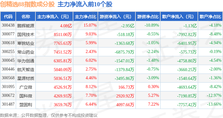 资金流向方面,创精选88(399291)指数成份股当日主力资金净流出合计8.92亿元,游资资金净流入合计9537.99万元,散户资金净流入合计7.97亿元。成份股资金流向详情见下表: