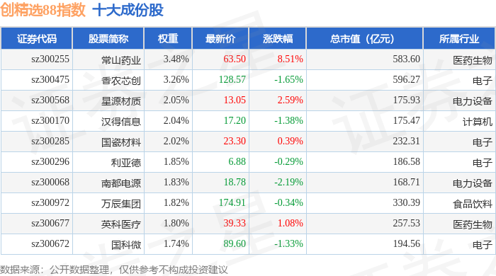 证券之星消息,10月30日,创精选88(399291)指数报收于4407.27点,跌0.52%,成交559.73亿元,换手率3.48%。当日该指数成份股中,上涨的有20家,鹏辉能源以20.0%的涨幅领涨,下跌的有68家,上海新阳以6.5%的跌幅领跌。