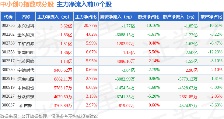 资金流向方面,中小创Q(399294)指数成份股当日主力资金净流出合计33.81亿元,游资资金净流入合计8.21亿元,散户资金净流入合计25.6亿元。成份股资金流向详情见下表: