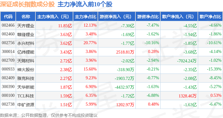 资金流向方面,深证成长(399346)指数成份股当日主力资金净流出合计136.17亿元,游资资金净流入合计48.59亿元,散户资金净流入合计87.59亿元。成份股资金流向详情见下表: