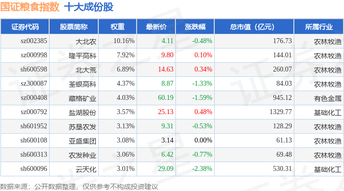 证券之星消息,10月30日,国证粮食(399365)指数报收于12824.93点,跌0.48%,成交203.03亿元,换手率2.07%。当日该指数成份股中,上涨的有20家,东方铁塔以2.61%的涨幅领涨,下跌的有29家,天康生物以5.0%的跌幅领跌。