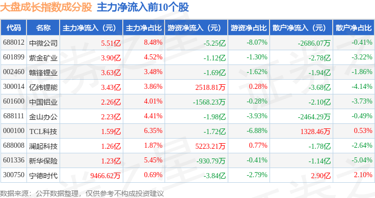 资金流向方面,大盘成长(399372)指数成份股当日主力资金净流出合计151.95亿元,游资资金净流入合计64.23亿元,散户资金净流入合计87.72亿元。成份股资金流向详情见下表: