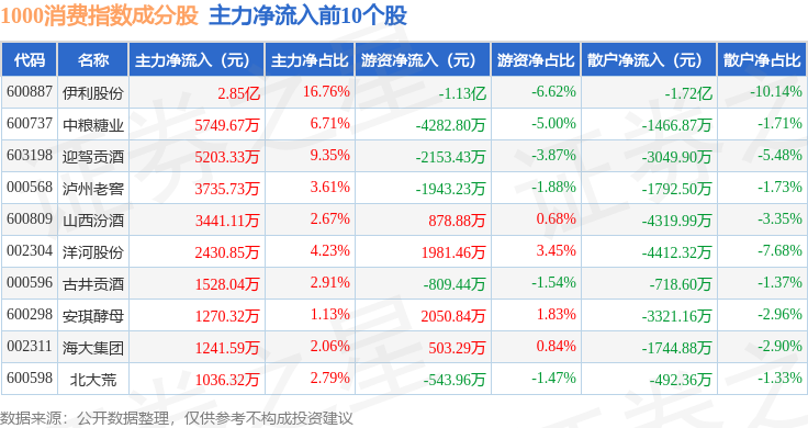 资金流向方面,1000消费(399385)指数成份股当日主力资金净流出合计8.7亿元,游资资金净流入合计5.4亿元,散户资金净流入合计3.29亿元。成份股资金流向详情见下表: