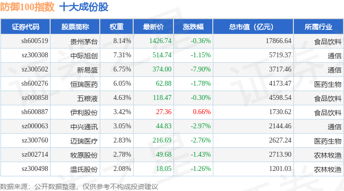 防御100(399403)指数十大成份股详情如下: