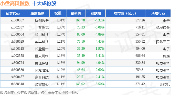 证券之星消息,10月30日,小盘高贝(399409)指数报收于6353.27点,跌0.78%,成交1656.94亿元,换手率4.56%。当日该指数成份股中,上涨的有33家,鹏辉能源以20.0%的涨幅领涨,下跌的有115家,斯达半导以7.34%的跌幅领跌。