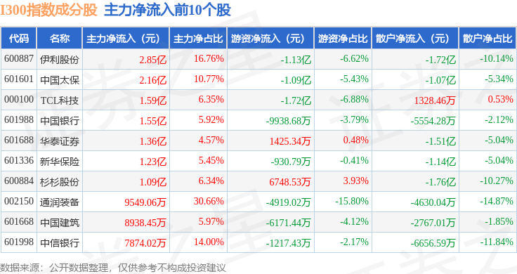 资金流向方面,I300(399416)指数成份股当日主力资金净流出合计75.28亿元,游资资金净流入合计10.82亿元,散户资金净流入合计64.46亿元。成份股资金流向详情见下表: