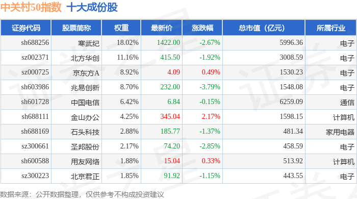 中关村50(399423)指数十大成份股详情如下: