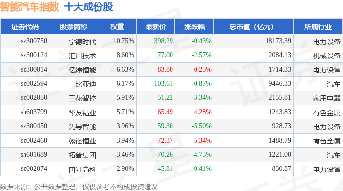 证券之星消息,10月30日,智能汽车(399432)指数报收于6904.09点,跌0.48%,成交1284.78亿元,换手率4.13%。当日该指数成份股中,上涨的有15家,天华新能以14.69%的涨幅领涨,下跌的有34家,斯达半导以7.34%的跌幅领跌。