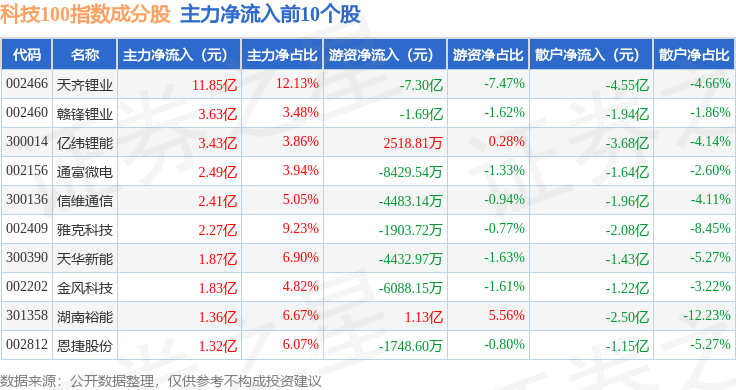 资金流向方面,科技100(399608)指数成份股当日主力资金净流出合计173.29亿元,游资资金净流入合计58.6亿元,散户资金净流入合计114.69亿元。成份股资金流向详情见下表: