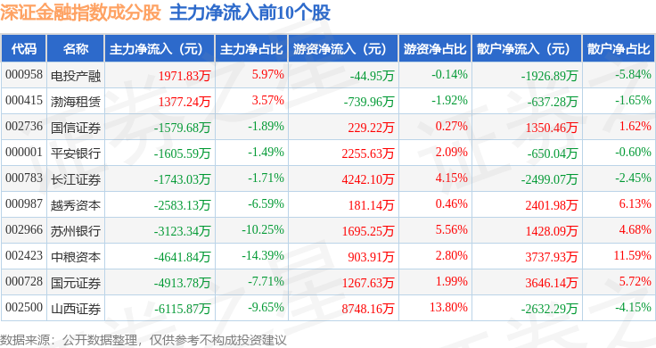 资金流向方面,深证金融(399619)指数成份股当日主力资金净流出合计42.22亿元,游资资金净流入合计17.1亿元,散户资金净流入合计25.12亿元。成份股资金流向详情见下表: