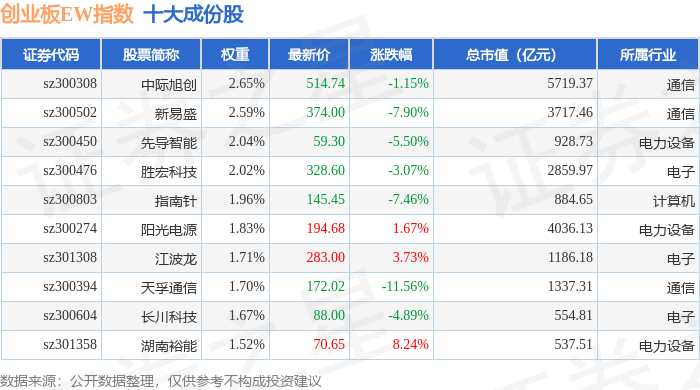 创业板EW(399635)指数十大成份股详情如下: