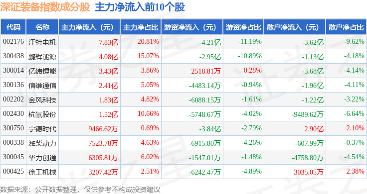 资金流向方面,深证装备(399636)指数成份股当日主力资金净流出合计132.13亿元,游资资金净流入合计41.23亿元,散户资金净流入合计90.89亿元。成份股资金流向详情见下表: