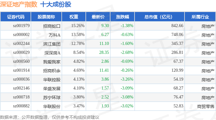 证券之星消息,10月30日,深证地产(399637)指数报收于1839.35点,跌2.22%,成交75.91亿元,换手率3.42%。当日该指数成份股中,上涨的有1家,南山控股以10.0%的涨幅领涨,下跌的有19家,盈新发展以9.21%的跌幅领跌。