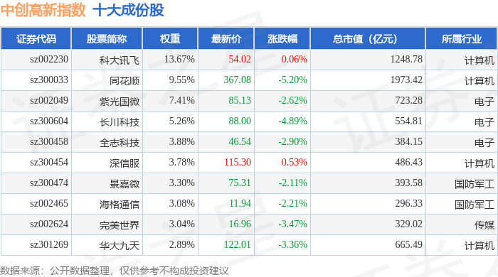 证券之星消息,10月30日,中创高新(399652)指数报收于3693.82点,跌1.94%,成交397.8亿元,换手率3.41%。当日该指数成份股中,上涨的有11家,绿盟科技以3.06%的涨幅领涨,下跌的有38家,舒泰神以5.73%的跌幅领跌。