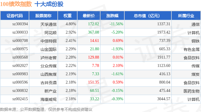 100绩效(399656)指数十大成份股详情如下: