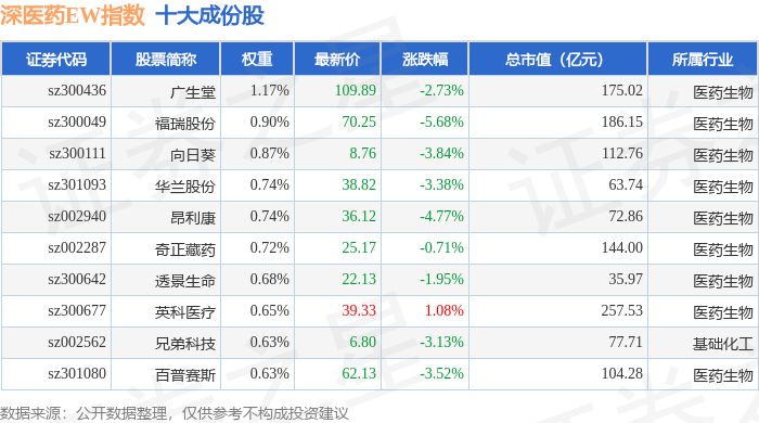 证券之星消息,10月30日,深医药EW(399676)指数报收于3814.64点,跌1.48%,成交565.93亿元,换手率2.41%。当日该指数成份股中,上涨的有30家,奥美医疗以9.97%的涨幅领涨,下跌的有185家,翰宇药业以10.23%的跌幅领跌。