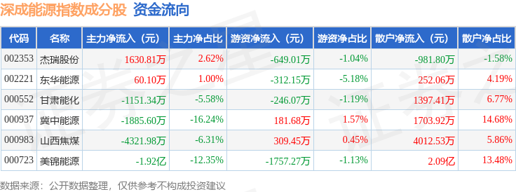 资金流向方面,深成能源(399680)指数成份股当日主力资金净流出合计2.48亿元,游资资金净流出合计2473.37万元,散户资金净流入合计2.73亿元。成份股资金流向详情见下表: