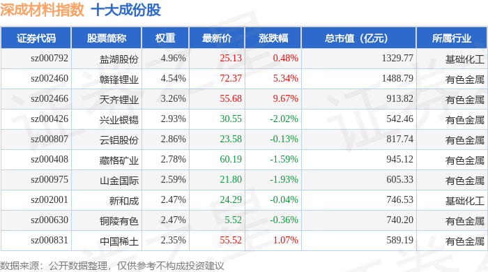 证券之星消息,10月30日,深成材料(399681)指数报收于1193.46点,涨0.73%,成交1030.97亿元,换手率2.43%。当日该指数成份股中,上涨的有36家,永兴材料以10.01%的涨幅领涨,下跌的有41家,菲利华以7.39%的跌幅领跌。