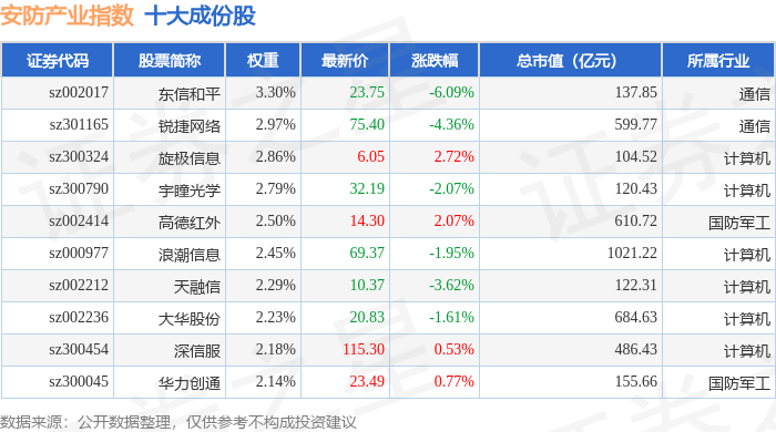 安防产业(399693)指数十大成份股详情如下: