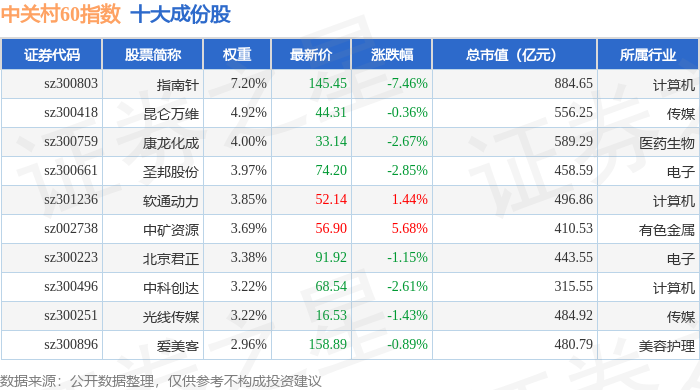 中关村60(399697)指数十大成份股详情如下: