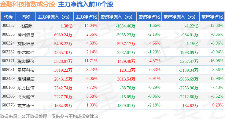 资金流向方面,金融科技(399699)指数成份股当日主力资金净流出合计79.51亿元,游资资金净流入合计25.67亿元,散户资金净流入合计53.83亿元。成份股资金流向详情见下表:
