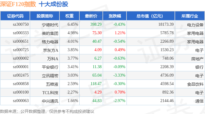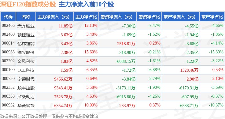 资金流向方面,深证F120(399702)指数成份股当日主力资金净流出合计121.45亿元,游资资金净流入合计28.09亿元,散户资金净流入合计93.36亿元。成份股资金流向详情见下表: