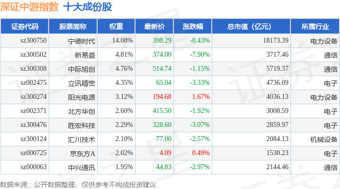 证券之星消息,10月30日,深证中游(399705)指数报收于4333.82点,跌1.69%,成交3878.15亿元,换手率2.64%。当日该指数成份股中,上涨的有40家,天华新能以14.69%的涨幅领涨,下跌的有109家,天孚通信以11.56%的跌幅领跌。