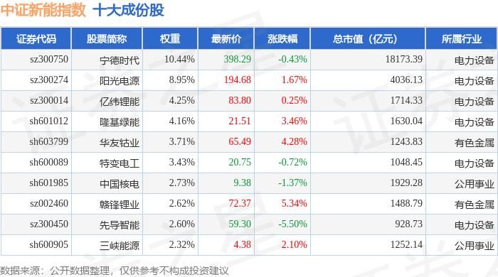 中证新能(399808)指数十大成份股详情如下: