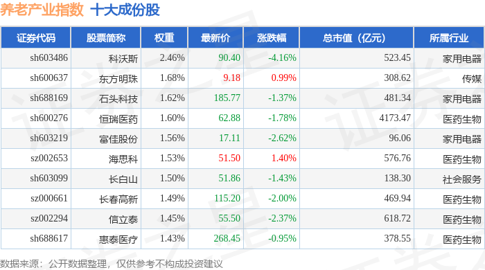 养老产业(399812)指数十大成份股详情如下: