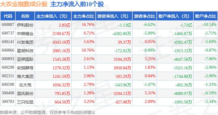 资金流向方面,大农业(399814)指数成份股当日主力资金净流出合计7.39亿元,游资资金净流入合计1.05亿元,散户资金净流入合计6.35亿元。成份股资金流向详情见下表: