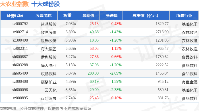 证券之星消息,10月30日,大农业(399814)指数报收于1156.19点,跌0.71%,成交250.84亿元,换手率1.35%。当日该指数成份股中,上涨的有19家,新乳业以2.47%的涨幅领涨,下跌的有30家,安琪酵母以5.2%的跌幅领跌。