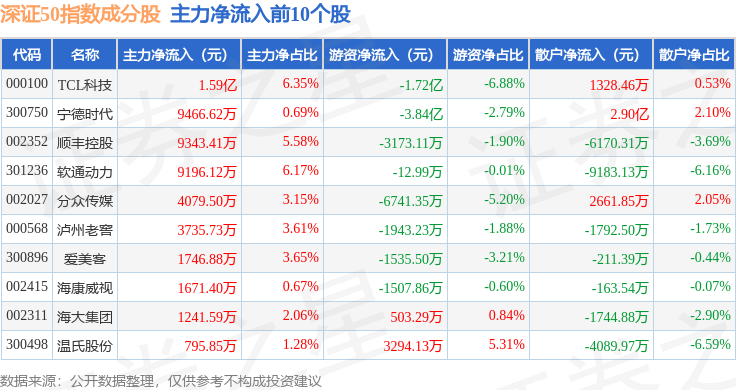 资金流向方面,深证50(399850)指数成份股当日主力资金净流出合计150.88亿元,游资资金净流入合计55.39亿元,散户资金净流入合计95.49亿元。成份股资金流向详情见下表: