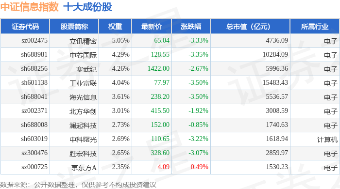 证券之星消息,10月30日,中证信息(399935)指数报收于6830.66点,跌2.08%,成交3334.65亿元,换手率2.73%。当日该指数成份股中,上涨的有26家,信维通信以7.41%的涨幅领涨,下跌的有100家,晶晨股份以9.71%的跌幅领跌。