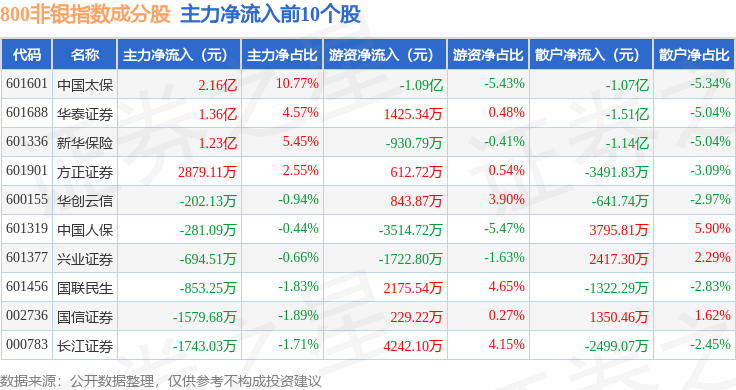 资金流向方面,800非银(399966)指数成份股当日主力资金净流出合计78.45亿元,游资资金净流入合计26.85亿元,散户资金净流入合计51.6亿元。成份股资金流向详情见下表: