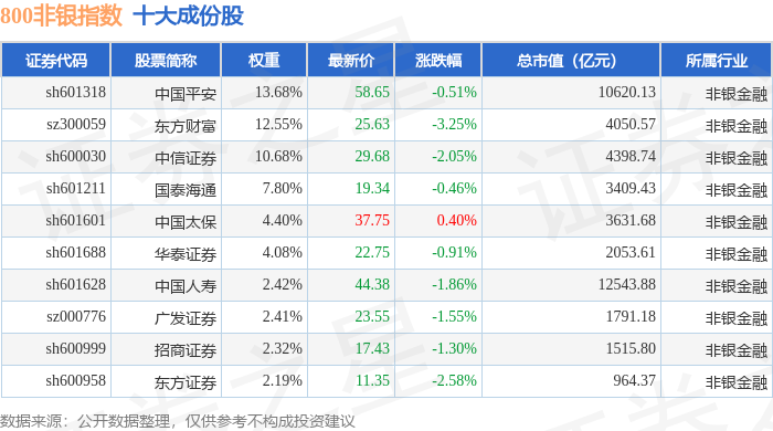 证券之星消息,10月30日,800非银(399966)指数报收于6634.44点,跌1.61%,成交697.1亿元,换手率1.38%。当日该指数成份股中,上涨的有2家,新华保险以1.21%的涨幅领涨,下跌的有47家,山西证券以4.73%的跌幅领跌。