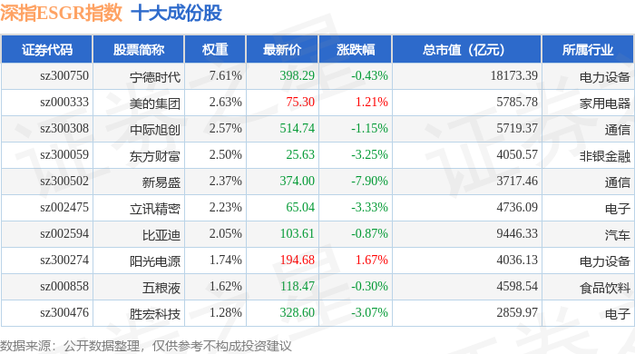 证券之星消息,10月30日,深指ESGR(470026)指数报收于19408.73点,跌1.17%,成交6308.74亿元,换手率2.18%。当日该指数成份股中,上涨的有111家,天华新能以14.69%的涨幅领涨,下跌的有284家,天孚通信以11.56%的跌幅领跌。